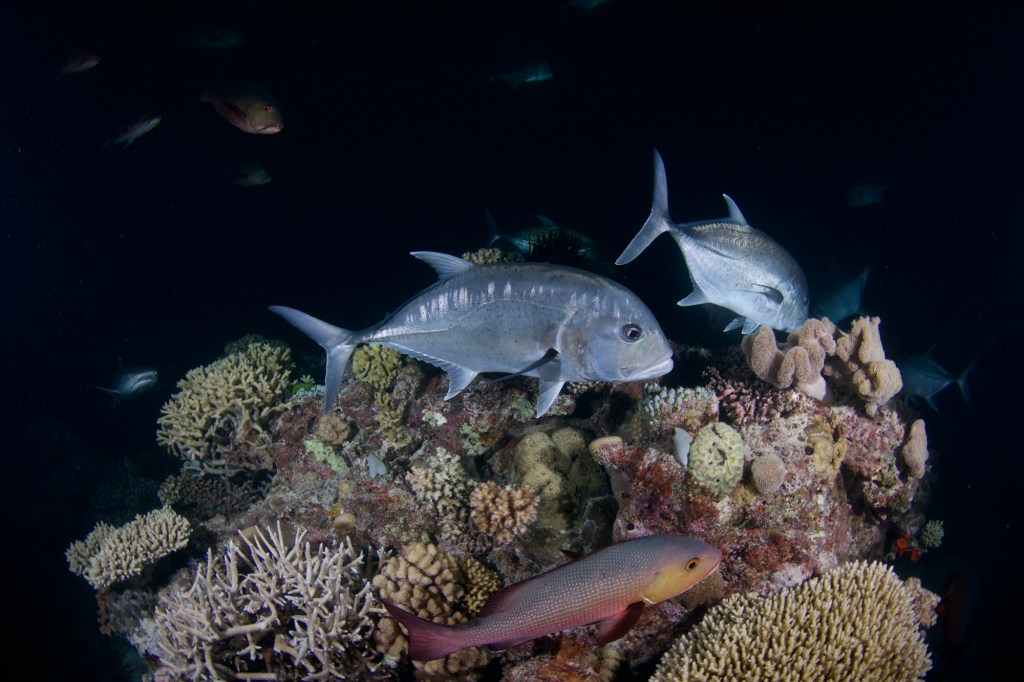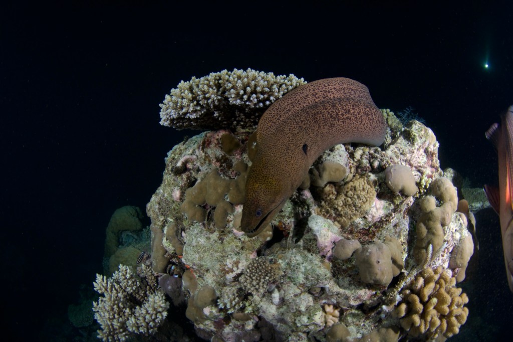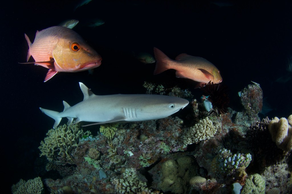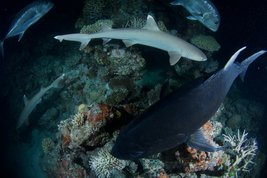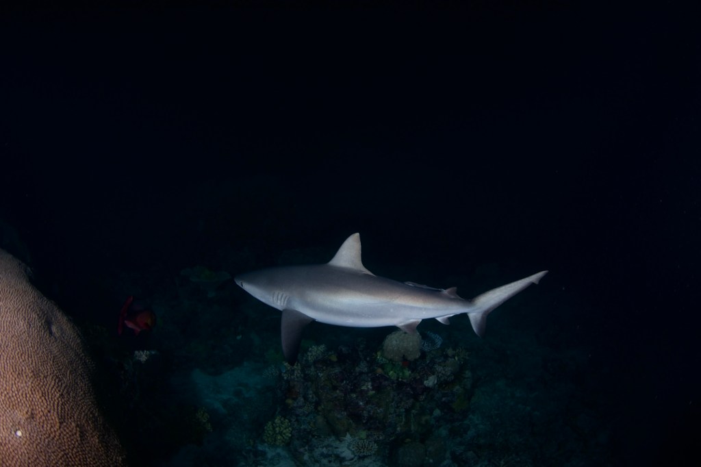We were advised during the briefing that the divers are actually helping out the night predators like the travelly and white tip reef sharks. They like divers and swim along with us as our dive lights point out the smaller reef fish who are no longer protected by the blanket of darkness. We do our best to keep the beams sweeping back and forth, but unfortunately our predator companions are very quick and the circle of life closes for a few.