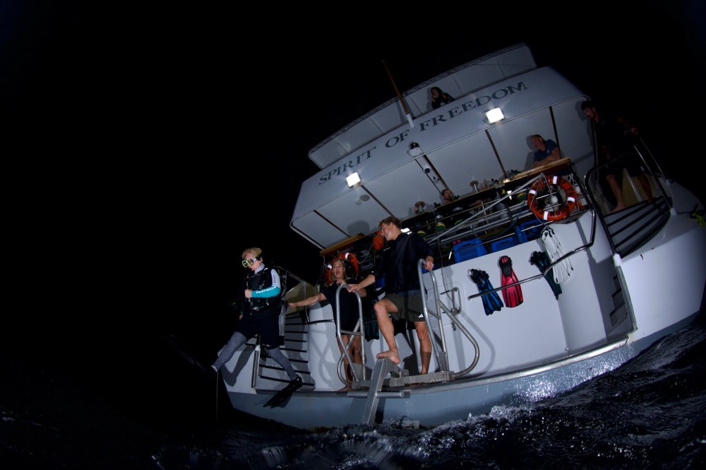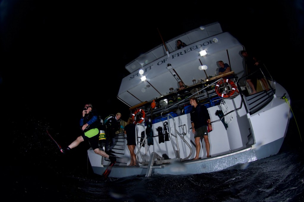 Flashlights (dive lights) in hand and glow sticks tied to our rig we enter the dark water off the dive platform. It helps that the boat also has two bright floods washing the deck and surrounding water with light.
