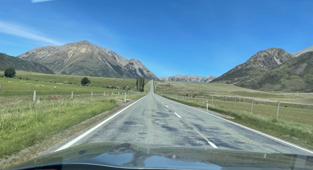 After some lunch in Arthurs Pass Village, it’s on the road again east towards Christchurch. After leaving Arthurs Pass the climate and landscape changes dramatically from wooded and green to arid and grasslands.